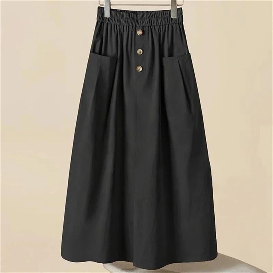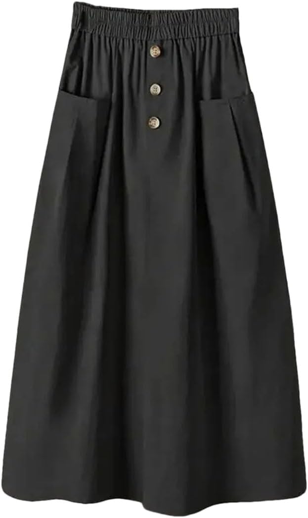 Women Elastic Waist Half Skirt Solid Color Ladies Pocket Skirt A-Line Knee-Length Skirt