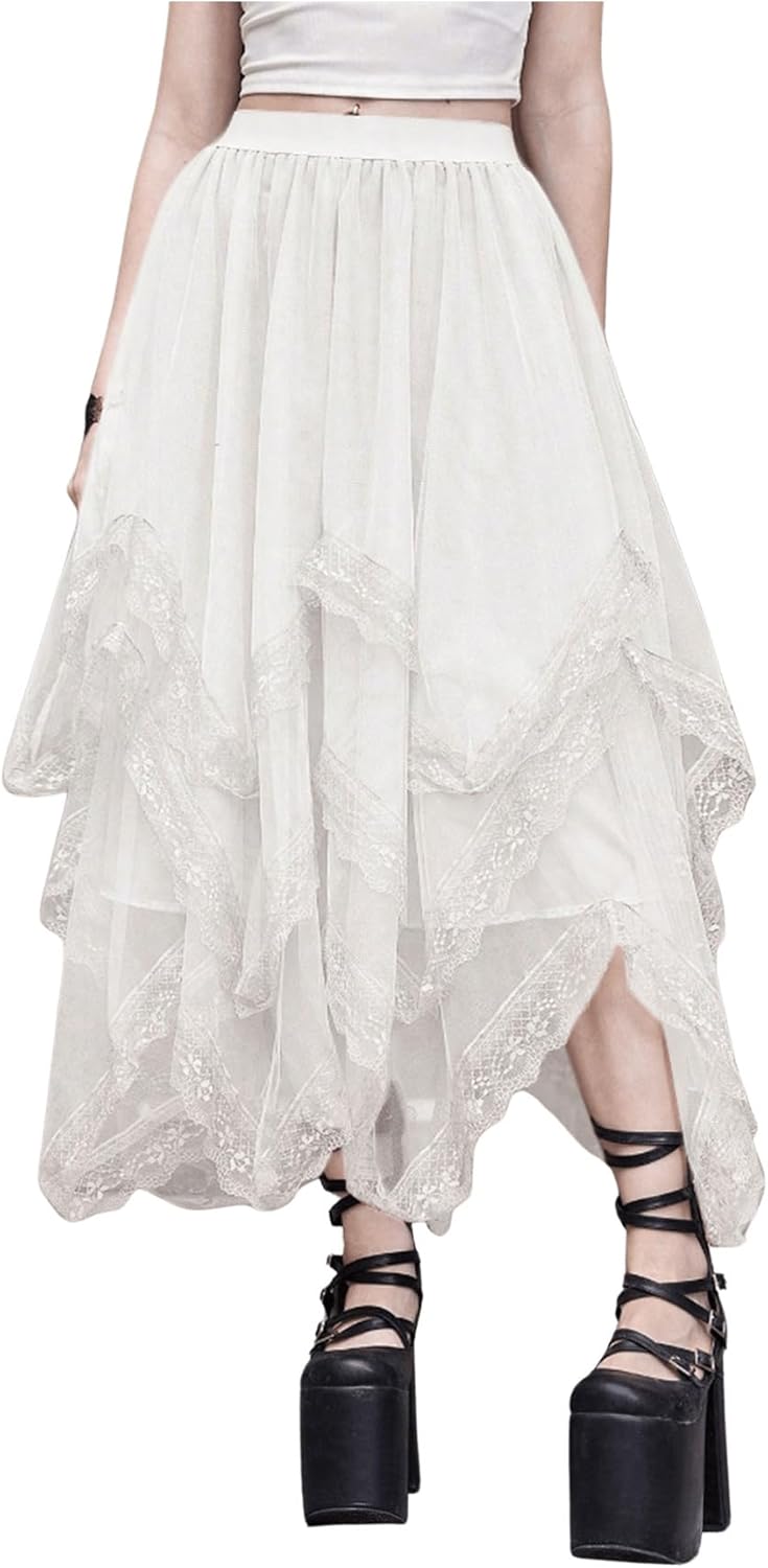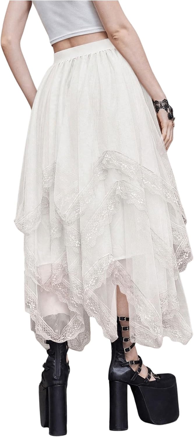 Women Lace Trim Layered Mesh Tulle Skirt High Waist Asymmetrical Long Goth Skirt